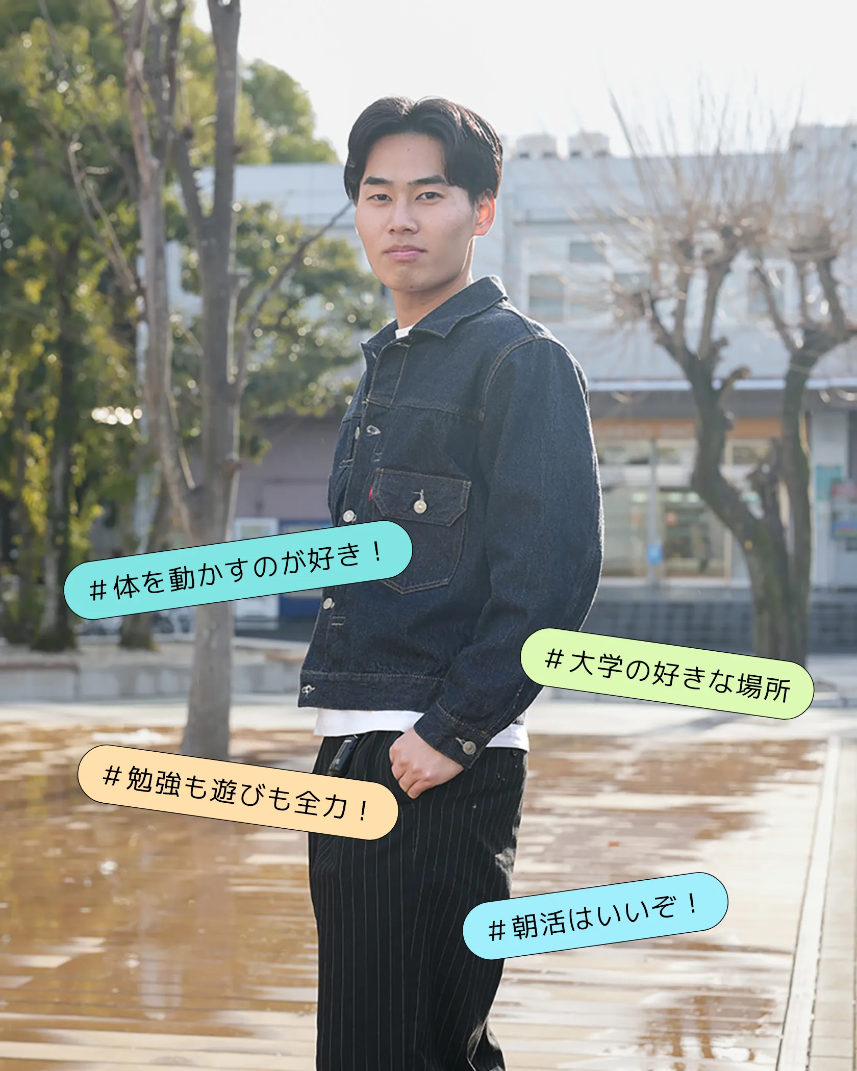 ついて教えて! - バスケットボールサークルに所属していて、多くて週に3回、大学や近くの体育館で活動しています。2年次にはサークル長を務め、夏・冬合宿を計画し、成功できたことが一番の思い出。